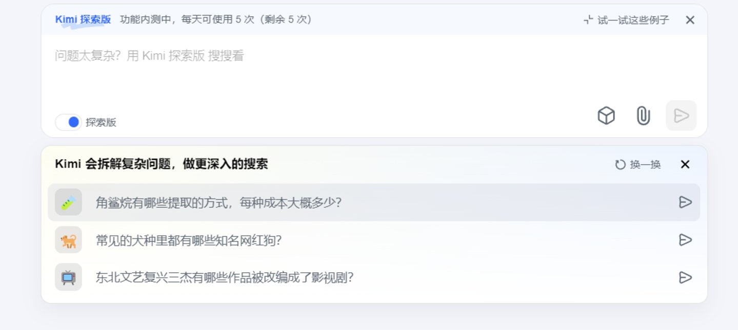 以月之暗面为例,其推出的Kimi探索版,便展现出在搜索领域的野心。Kimi探索版在功能上进行了创新升级,它能够对用户输入的问题进行拆分,有效避免了大模型常见的 “幻觉” 问题,并且搜索量大幅提升,一次搜索即可精读超过500个页面。这一产品的推出,无疑是月之暗面在AI搜索领域的一次大胆尝试。
