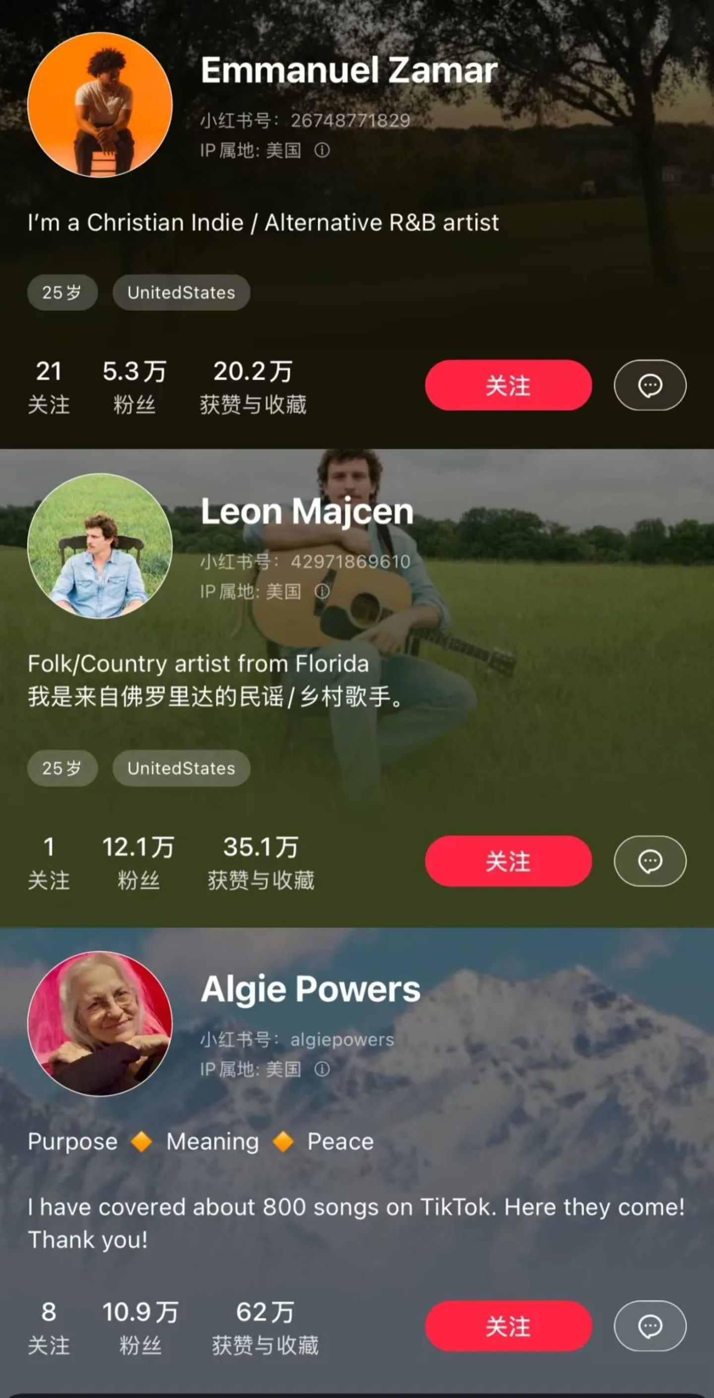 比如,原创R&B音乐人Emmanuel Zamar,短短三日便在小红书吸粉近5.3万,而他在海外TikTok上的粉丝量仅为5049;乡村民谣音乐人Leon Majcen,仅凭5个视频就成功吸引12.1万关注;TikTok达人Algie Powers发布10段弹唱视频,迅速席卷10.9万粉丝。