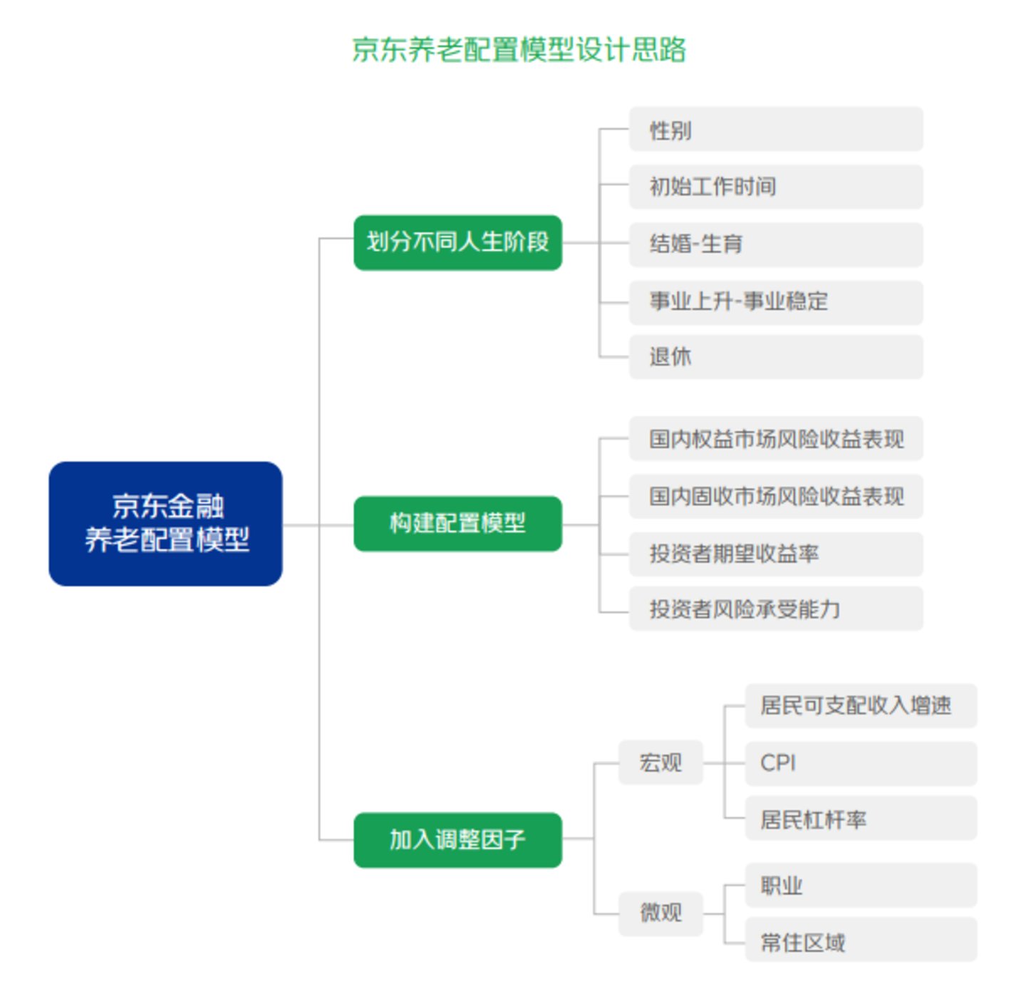 针对上述提到的我国个人养老金发展问题以及投资者的个性化需求,京东金融推出“京东财富养老下滑曲线配置模型(JD-RGP)”,对标海外养老下滑需求,同时根据中国居民常见人生阶段划分和性别划分设计出适合中国资本市场风险收益表现的配置模型,同时附带宏观和微观调节因子,用以指导不同养老业务场景的资产配置实践,希望给投资者提供优质的养老方案。
