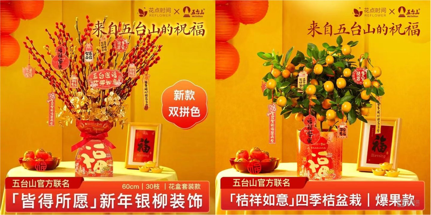 在今年新年期间,花点时间则推出了与五台山联名的盆栽,这一创意同样吸引了众多年轻人的目光。通过将“玄学”理念与绿植文化相结合,不仅为消费者提供了一种独特的消费体验,更传递了一种追求心灵宁静与好运的美好愿景。