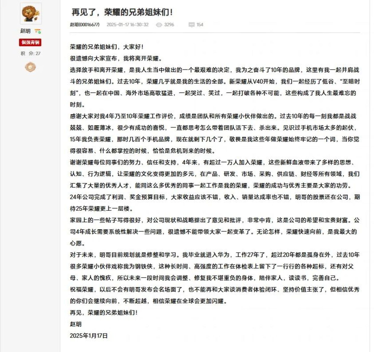 某种意义上,赵明也算是在荣耀的高光时刻退出。按照他在告别信里的说法,“2024年公司完成了利润、奖金预算目标,大家收益应该不错,收入、销量达成率也不错。”