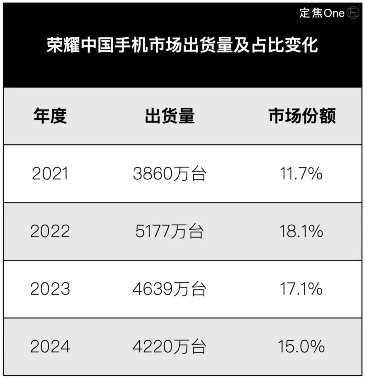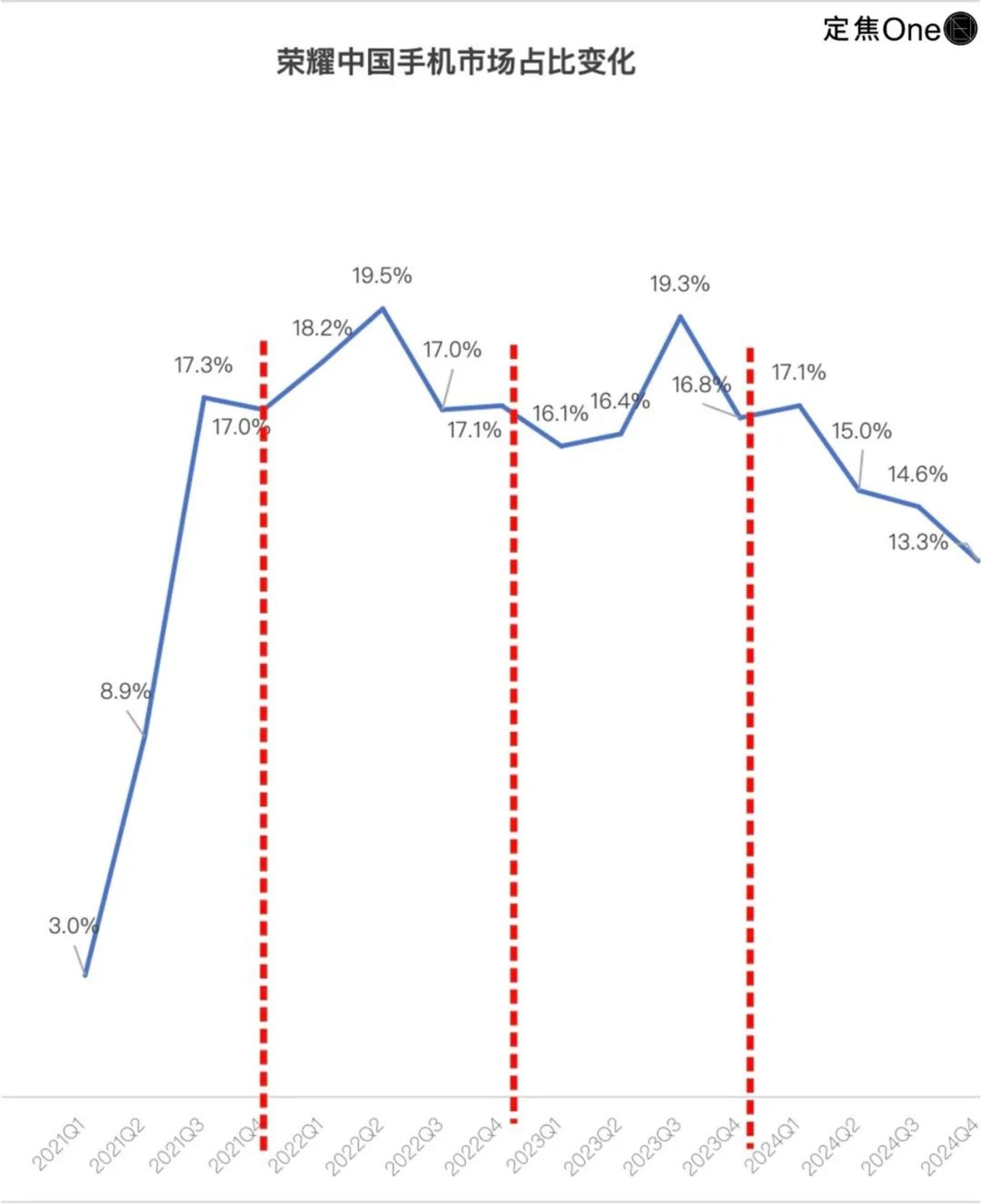 荣耀过去一年的市场表现比较低迷,国内排名从2024第一季度的第一,到年底跌到第五;2022-2024年全年,市场份额从18.1%降到15%。