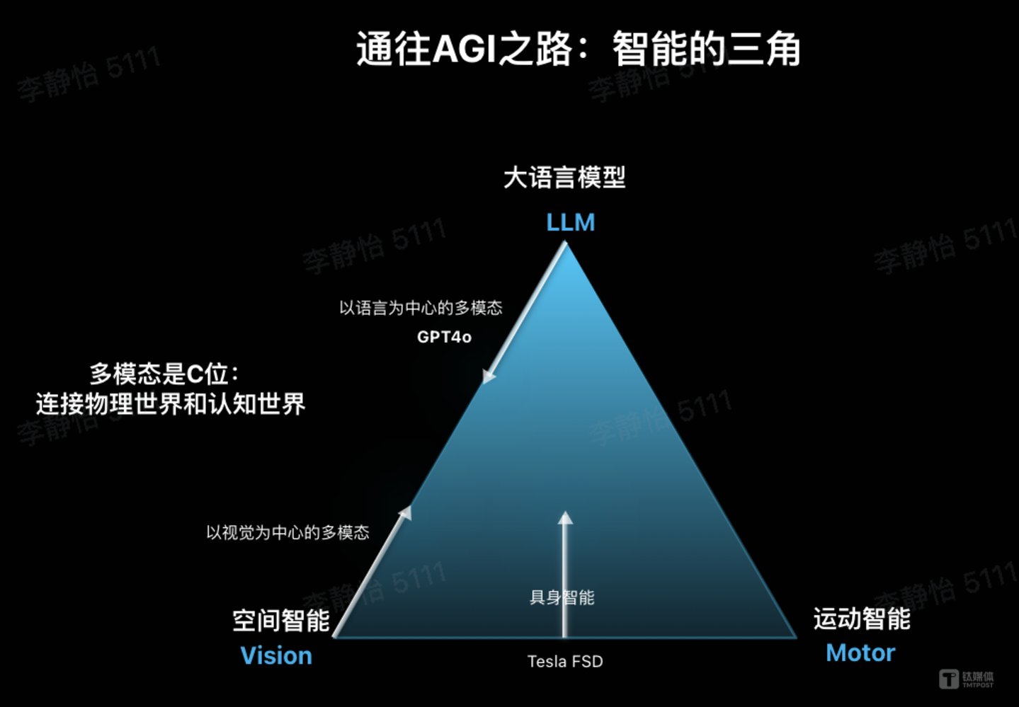 2024年,连诺贝尔奖都重点在 AI 领域了。这两年大语言模型一来,大家都更热衷去做语言模型,“吟诗作画”,但大家对于视觉、空间智能布局并不多。而我们是这么理解的,AGI 大的层面包括三个方面:第一是以人类语言为基础的认知模型;第二是对物理世界进行建模的感知模型,其中视觉是最重要的(也叫空间智能);第三是运动(和控制),比如自动驾驶、具身智能、机器人等。