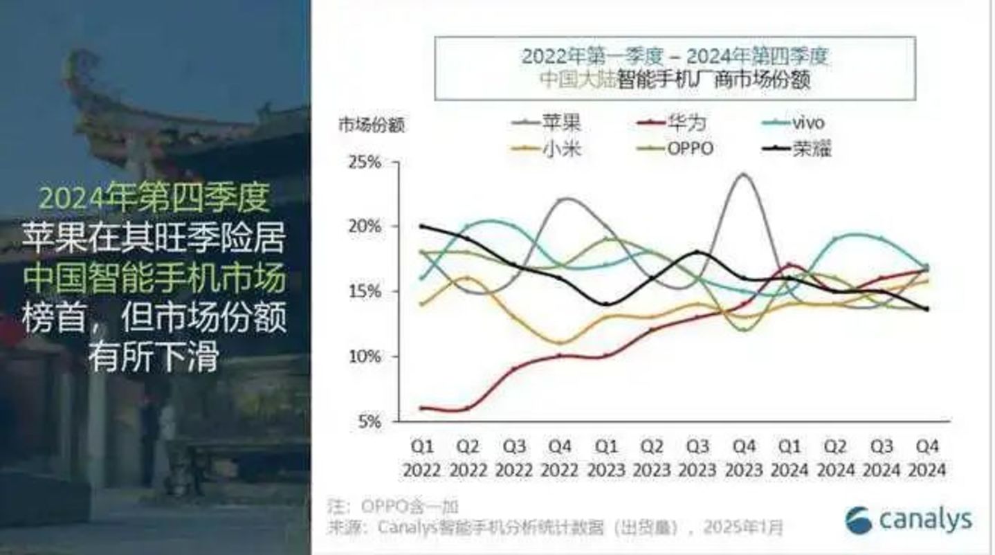 Canalys调研显示,从2024年一季度开始荣耀市场份额持续下跌,刚刚过去的第四季度其市场份额已跌出了前五位置。