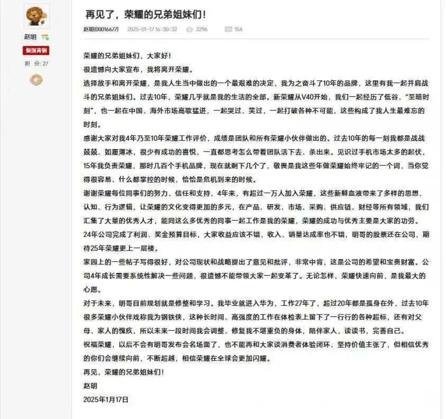 16点30分,赵明在荣耀内部论坛“家园”上发布告别信,确认自己“将离开荣耀”,并称这是其“人生中做出的一个最艰难的决定”,但并未提及自己的未来去向,表示接下来将调整和修复身体。
