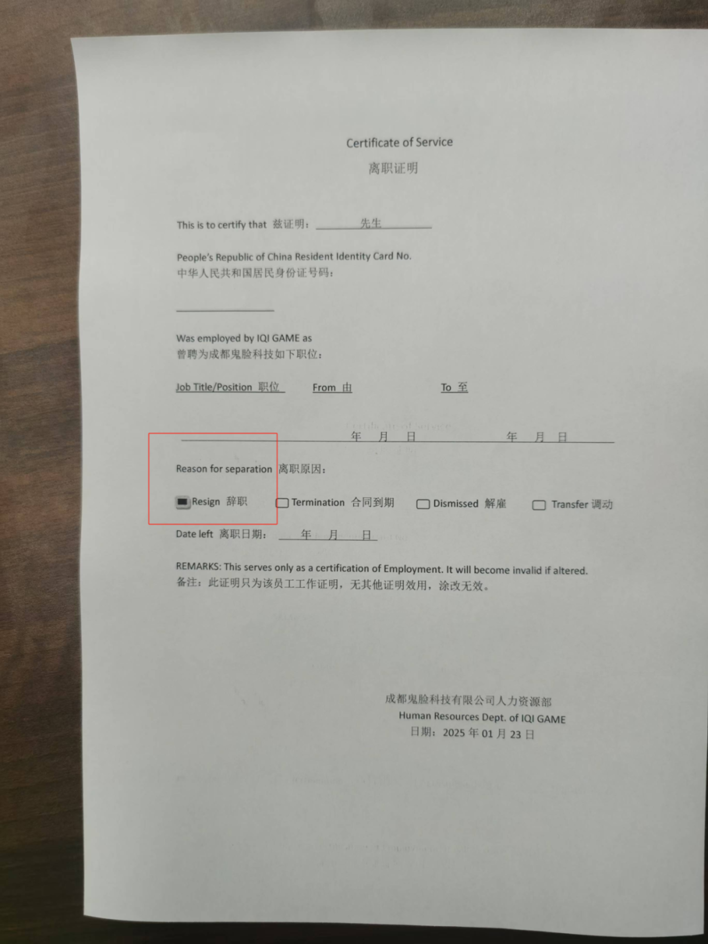 部分采访对象向茶馆提供了鬼脸当时下发的离职证明,其上显示离职原因是“辞职”,并非人为书写,而是机器批量打印,员工能做的只有填写。