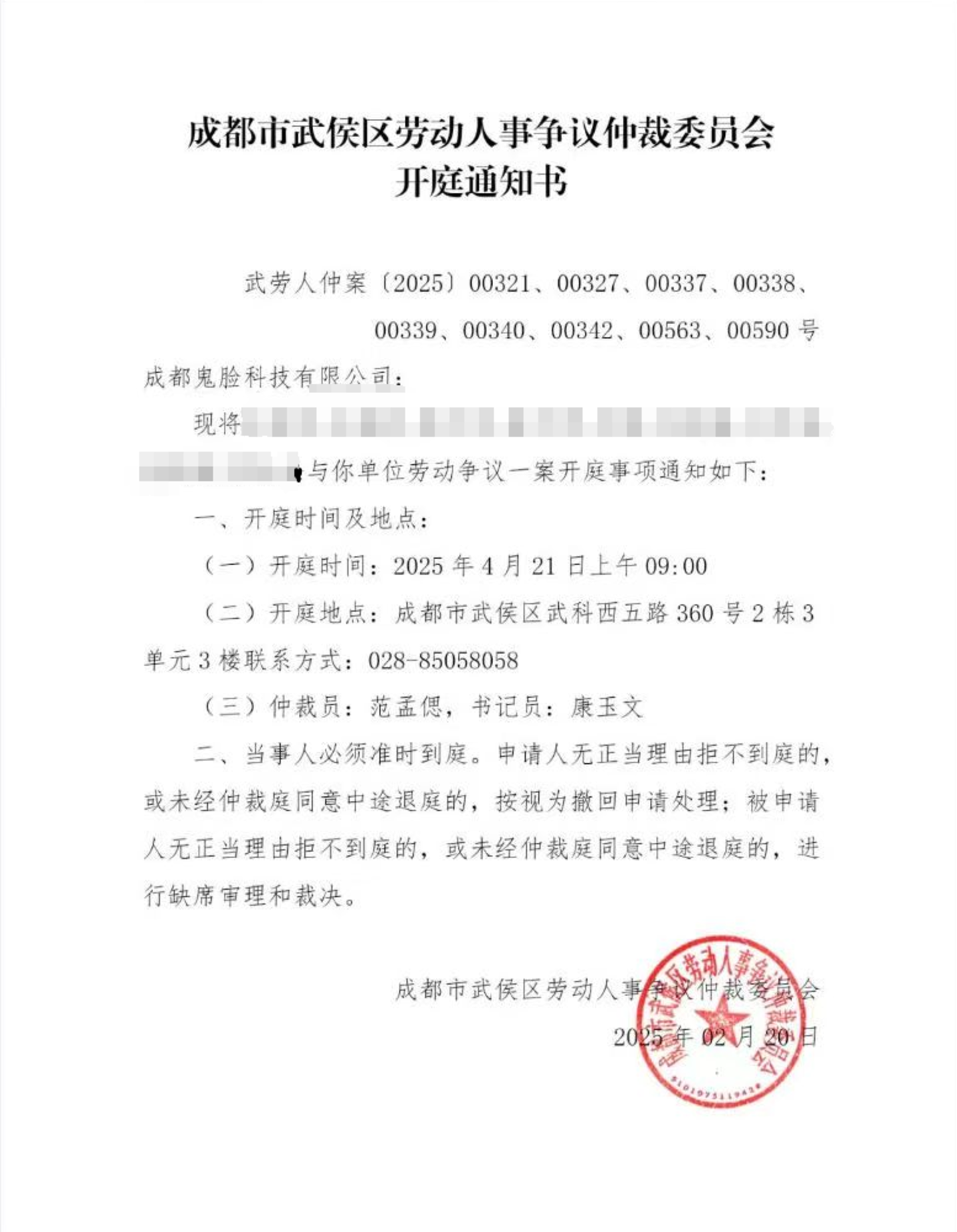 目前,成都市武侯区劳动人事争议仲裁委员会已受理部分鬼脸员工的劳动仲裁申请,4月开庭。这些员工的诉求,只是要回三个多月的工资并要求鬼脸补齐社保公积金,大多数金额其实也只有3、4万元左右。