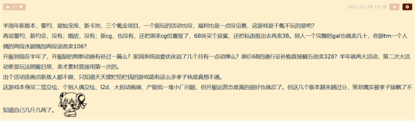 无内容可玩、官方的失信让《灵魂潮汐》的用户大量流失,此外,台词语音问题、“ML”等二游常见节奏,也在《灵魂潮汐》的社区肆虐,鬼脸在这一过程中并未起到解决问题的作用,同时,也没有平衡好大中R与一般玩家之间的权重。