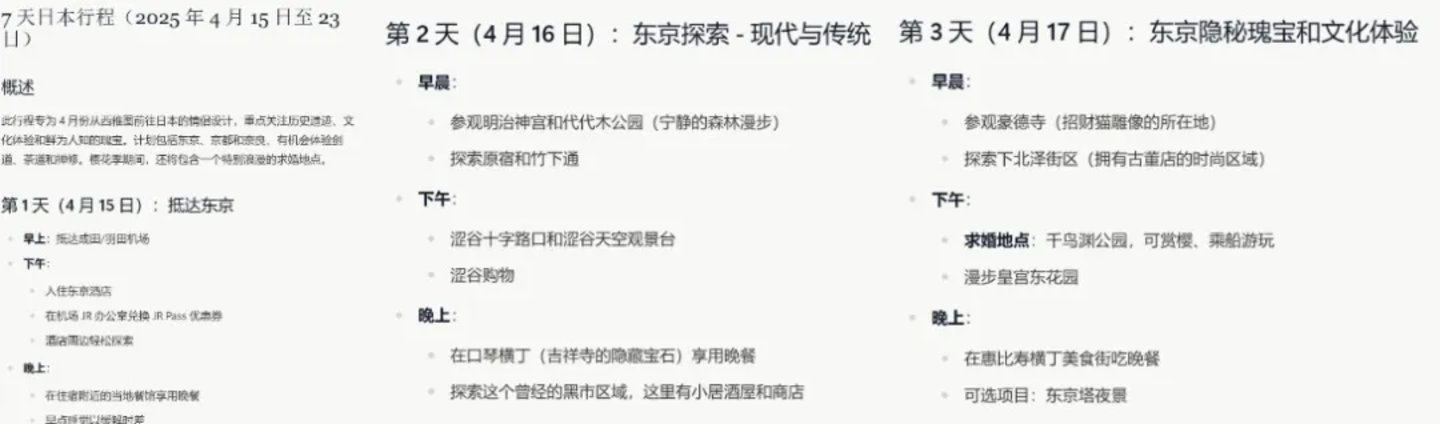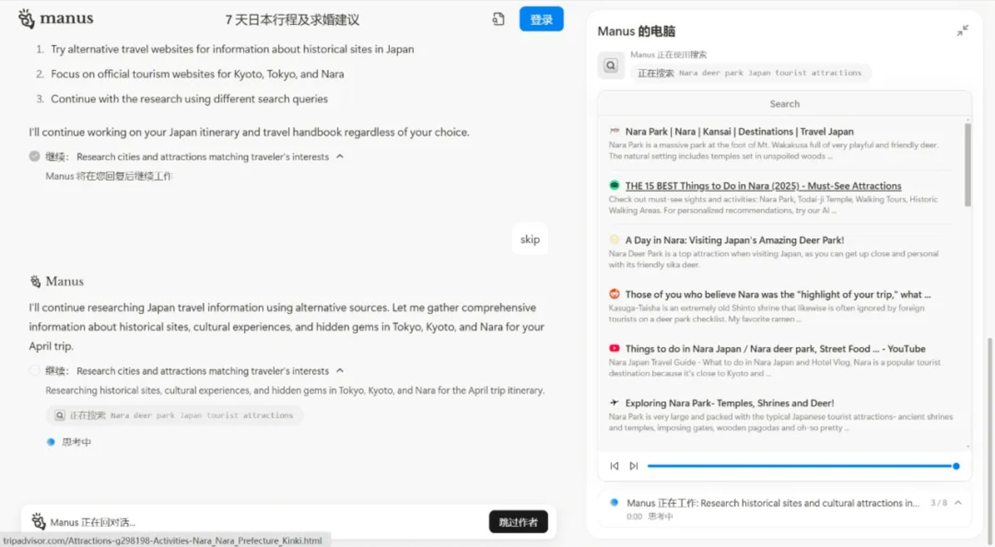 从官网的一个例子来看,当用户向Manus提出让它帮忙撰写一个“7天的日本行程及求婚建议”时。Manus会像DeepSeek一样思考,并拆解任务,罗列出待办事项清单。然后它会开始像人类一样,浏览网页、收集数据,并整理信息。
