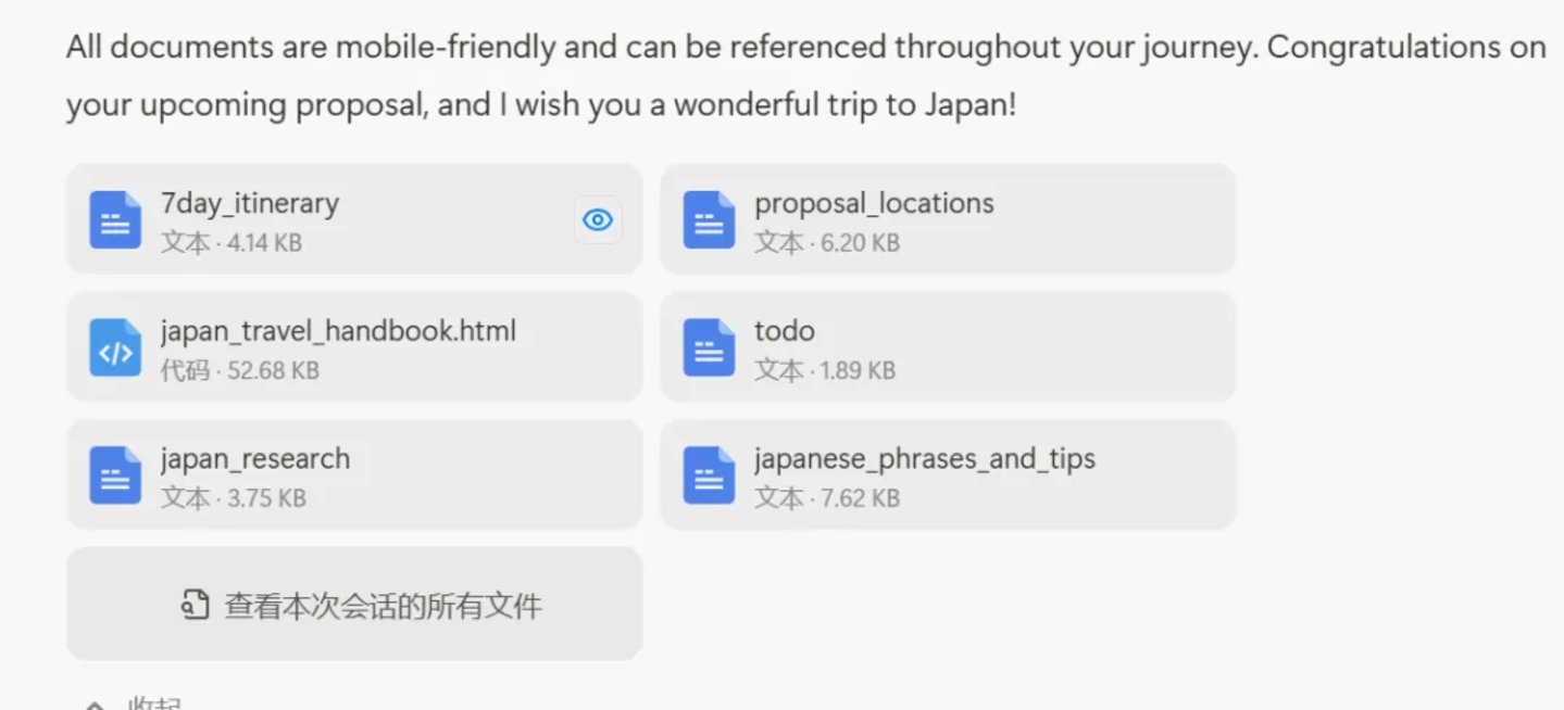 相关工作完成之后,Manus会输出6份文件,其中包括7天的行程安排、浪漫的求婚地点汇总、一份日本旅游研究、一份HTML文件、一份待办事项清单(这不是用户去日本要完成的事,而是Manus在制定计划的过程中需要完成的工作,比如了解去日本旅游的基础知识、研究城市和景点、创建行程等)。