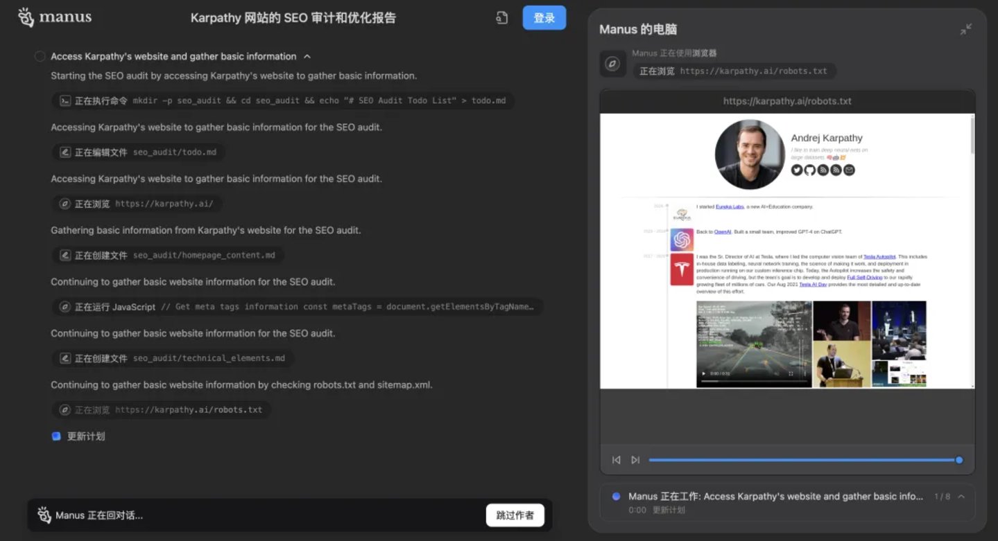 因此对于Manus,王强的判断是它目前能够完成基本的工作,但想要依靠Manus将SEO做好、做精,从目前的Demo来看,还无法做出判断。
