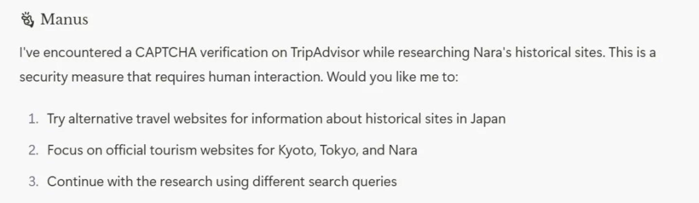 甚至Manus在访问网页时,也会遇到验证码的问题,并且被展示出来。