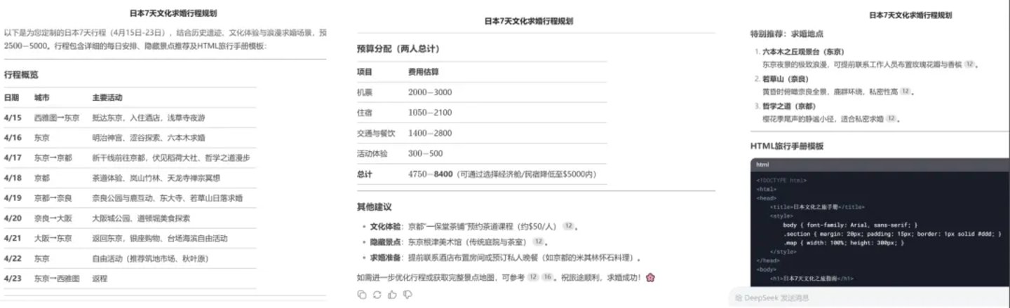 其中,DeepSeek官方版本在深度思考后,分别输出了7天的行程安排、特别推荐的求婚地点、HTML旅行手册模板、预算分配和其他建议。内容相对简单,但信息完整可用。