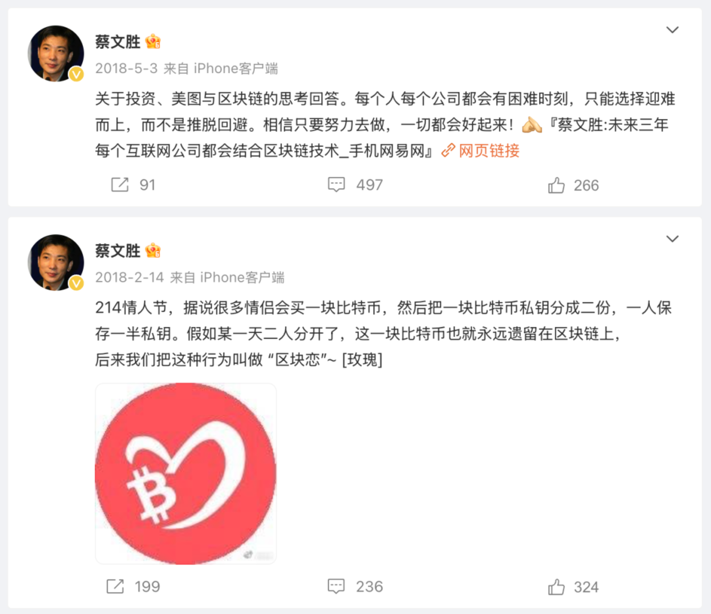 蔡文胜自 2018 年 5 月起就再也没有更新过微博。主页上,他发布的最后两条微博都和区块链有关,一条是称未来三年每个互联网公司都会结合区块链技术,一条是情人节时发的“区块恋”谐音梗。
