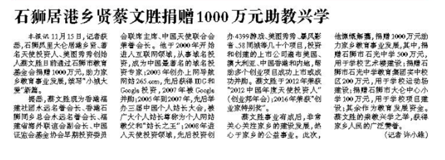 过去一年他大概只有一次在内地的公开报道,还是 2024 年 11 月他为自己家乡石狮市捐赠 1000 万元的新闻。《石狮日报》专门写了篇报道放在头版:《石狮居港乡贤蔡文胜捐赠 1000 万元助教兴学》。