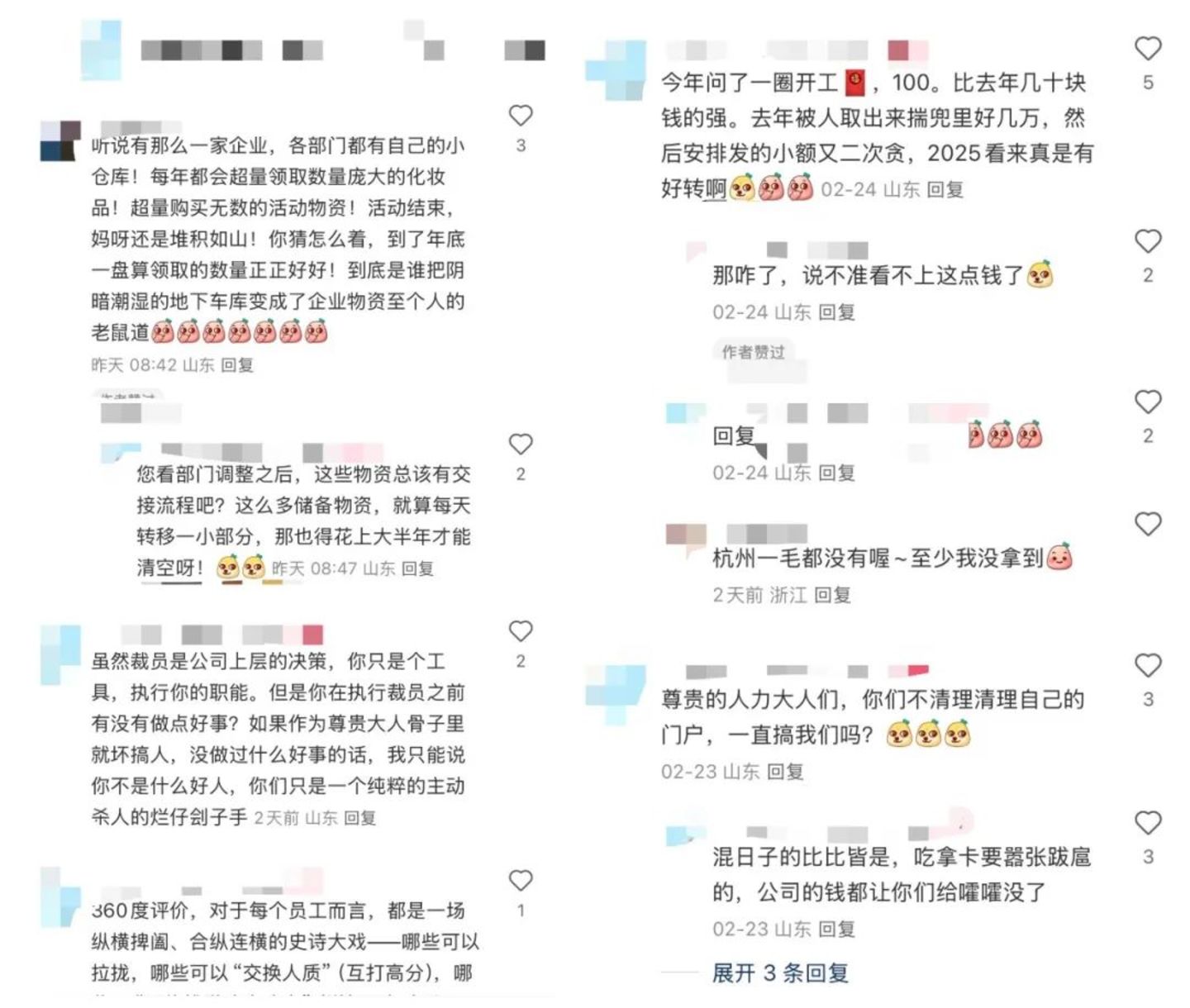根据诸多吐槽来看,这只是内部的一个小切面,被曝出的还有“100的开工红包员工到手大缩水,甚至根本没有”、“各个部门都有自己的小仓库,超量购买互动物资”等情况。有疑似曾在华熙生物工作过的网友@无脑搞人仲裁小红薯爆料,“开工红包去年被人取出来揣兜里好几万,然后安排发的小额又被二次贪。”