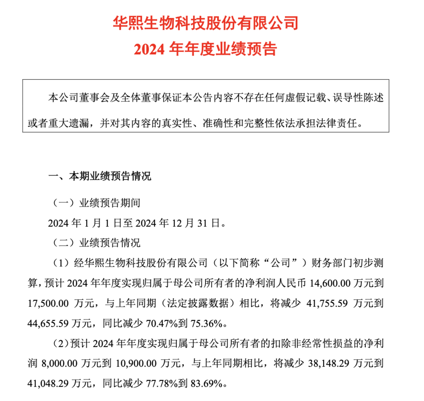 这一动作背后,是华熙生物持续下滑、濒临崩盘的业绩。2月28日,华熙生物发布了“2024年度业绩快报公告”,数据显示营收比上年同期下降11.60%,而利润直接大降72.27%。