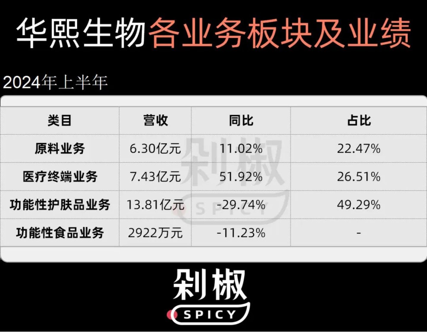 这一板块曾是华熙生物的支柱型业务,2022年占比超过7成,当年四大核心品牌均同比增长、风光无限。然而从2023年起,该业务板块开始下滑,到2024年上半年该业务板块收入占比已降到50%以下。