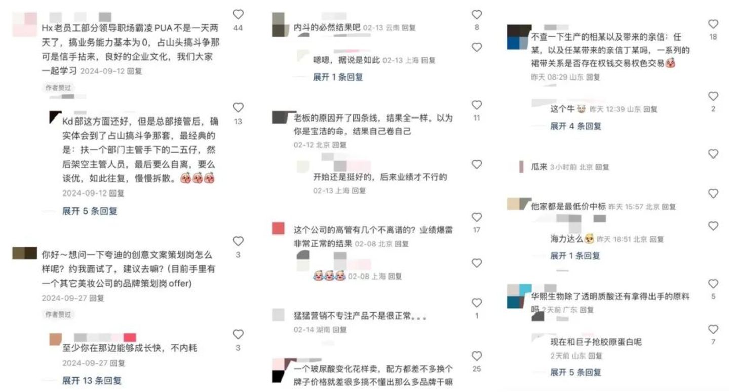 其实在之前,社交平台上就有多名号称“前员工”的网友爆料华熙生物内部管理混乱,去年枝繁繁事件更是让华熙内部的管理弊病摆上台面。