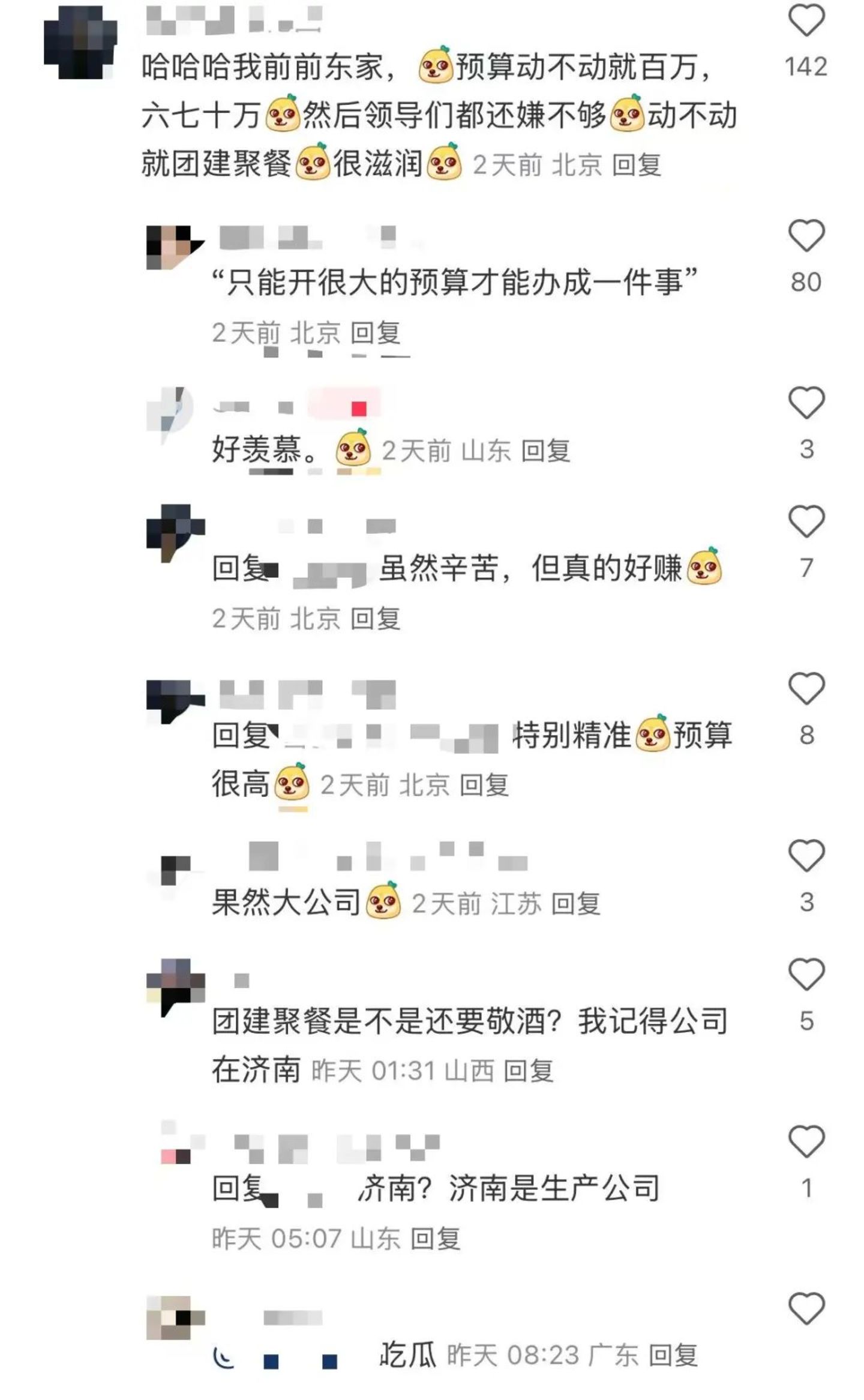 典型如“只有开很大预算才能办成一件事情”,有自称是前员工的网友@御姐的后花园表示,“我前前东家,宣发媒介公关活动的预算动不动百万,六七十万,然后领导们还嫌不够,动不动就团建,很滋润。”