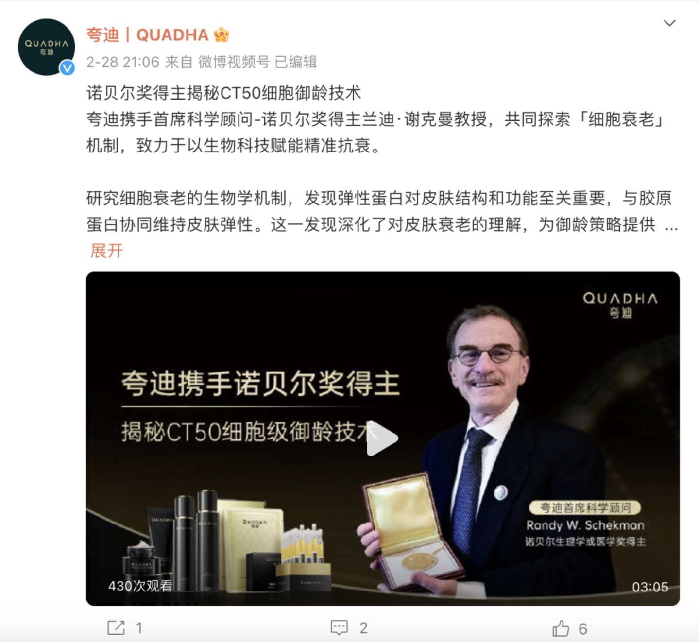 今年2月,夸迪进行了一场公开的品牌升级,强调“通过生物科技实现衰老干预和再生”,推出了“CT50超弹家族”产品。此外,夸迪还官宣2013诺贝尔生理学或医学奖得主兰迪·谢克曼为品牌顾问,并成立了夸迪细胞科学专家委员会。