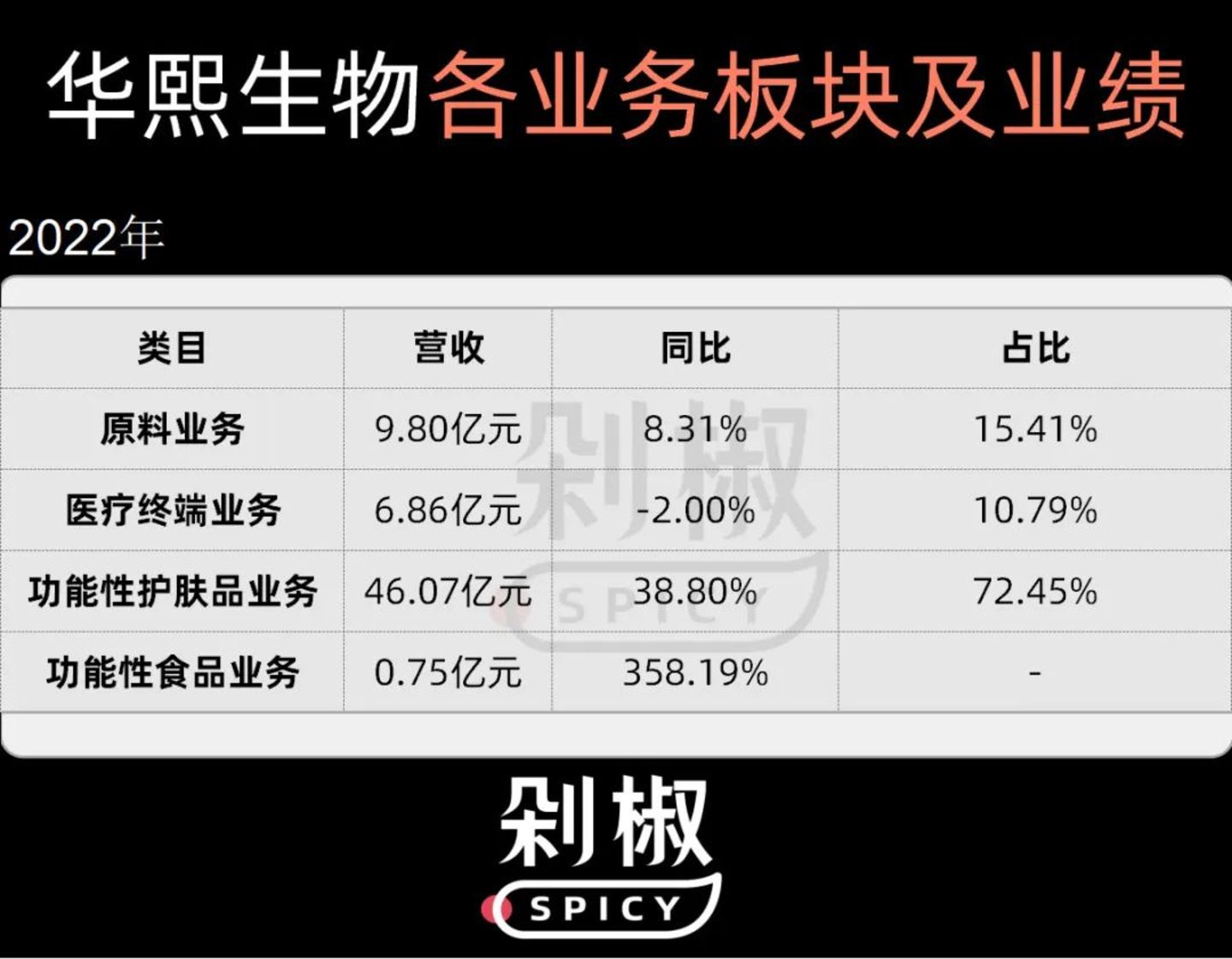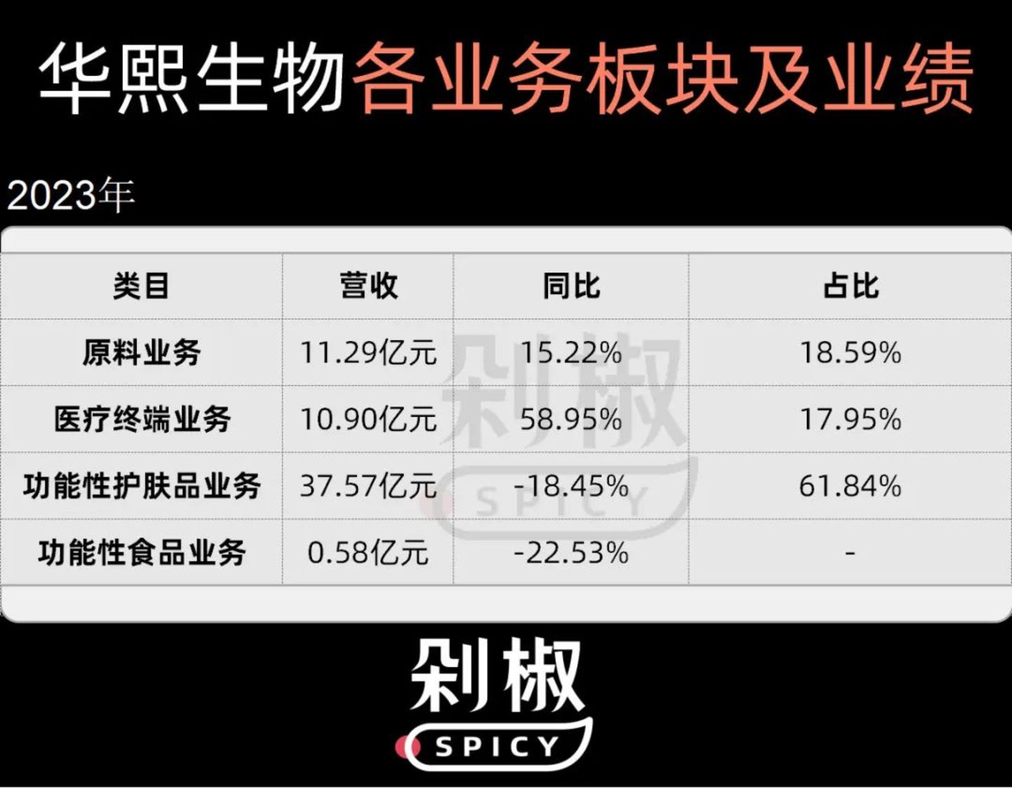 从具体业务来看,华熙生物营收和利润的下降,关键在于公司营收占比较高的功能性护肤品业务下滑明显,也就是包括润百颜、夸迪、米蓓尔、肌活等在内的品牌业务。