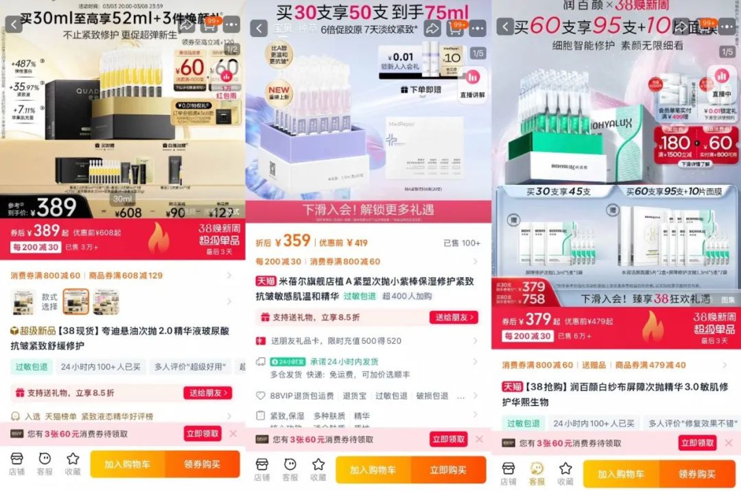 品牌数量多起来了,但不同产品之间定位也逐渐模糊了,就连核心品牌也越来越不分你我,以其原本的支柱品牌为例,润百颜、夸迪、米蓓尔均有玻尿酸次抛产品,且价格带都在30支300~400元之间,润熙泉也有同价格带的次抛精华。