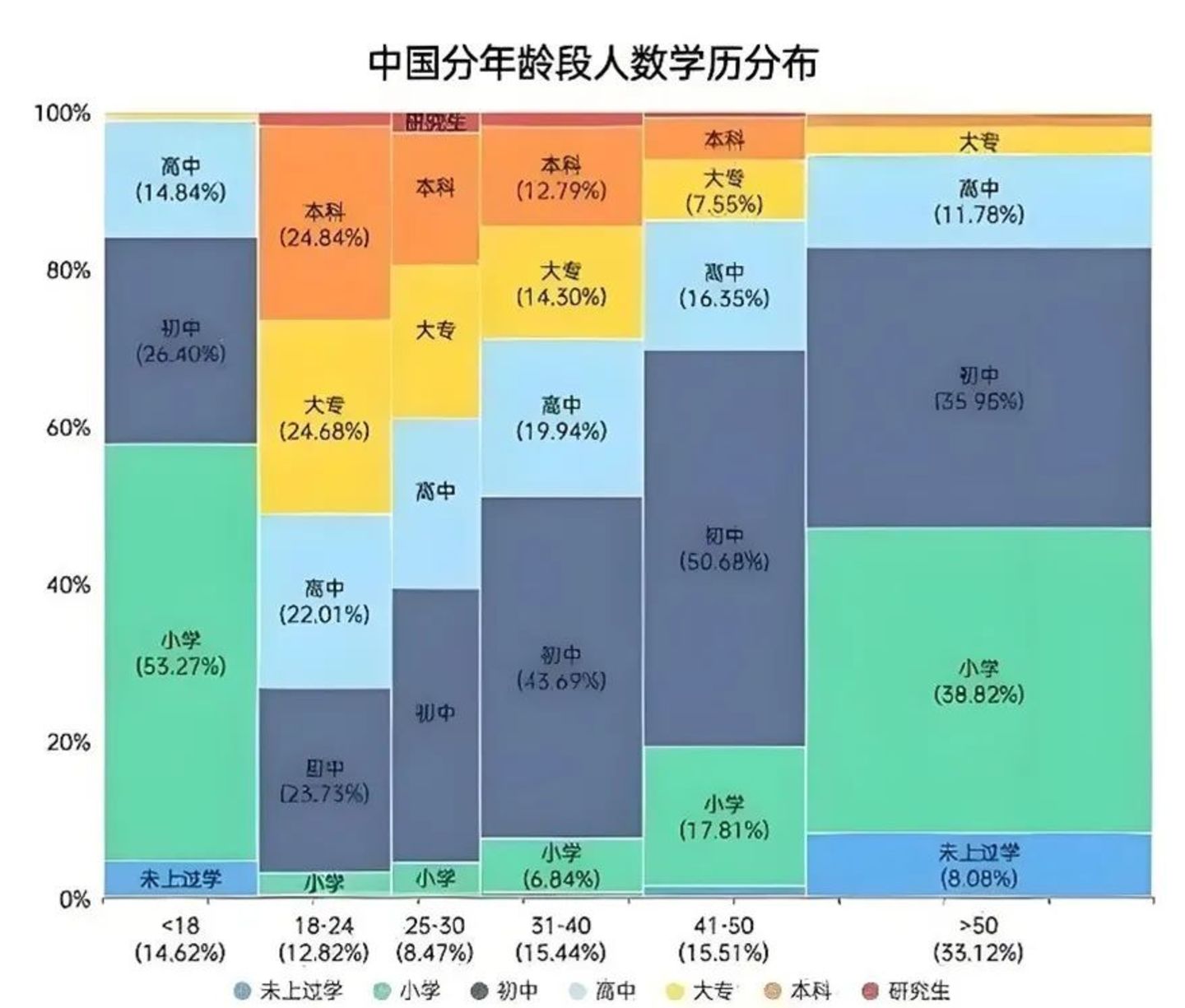 图:中国分年龄段人数学历分布,来源:国家统计局第七次人口普查