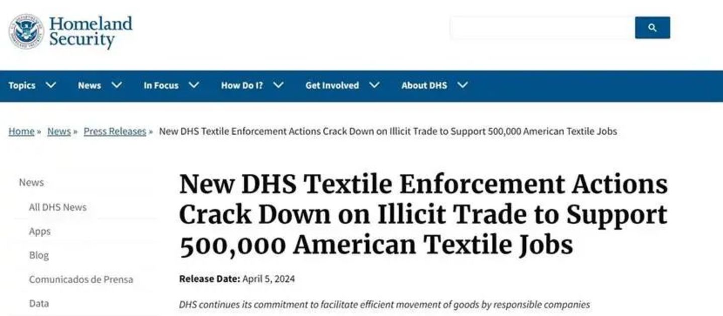服装纺织产业链不仅对中国重要,最近再度发酵的“美国小额包裹关税政策”事件,所折射的其实正是美国对其“50万美国纺织业岗位”的重度关切:早在2024年4月,美国即已对利用“小额免税”政策进入美国的包裹实施了更加严格的审查。在当时美国国土安全部的公告中,除了强调打击非法进口活动外,也在标题里直白地表示此次“增强执法行动”意在支持“50万美国纺织业岗位”(见下图)。