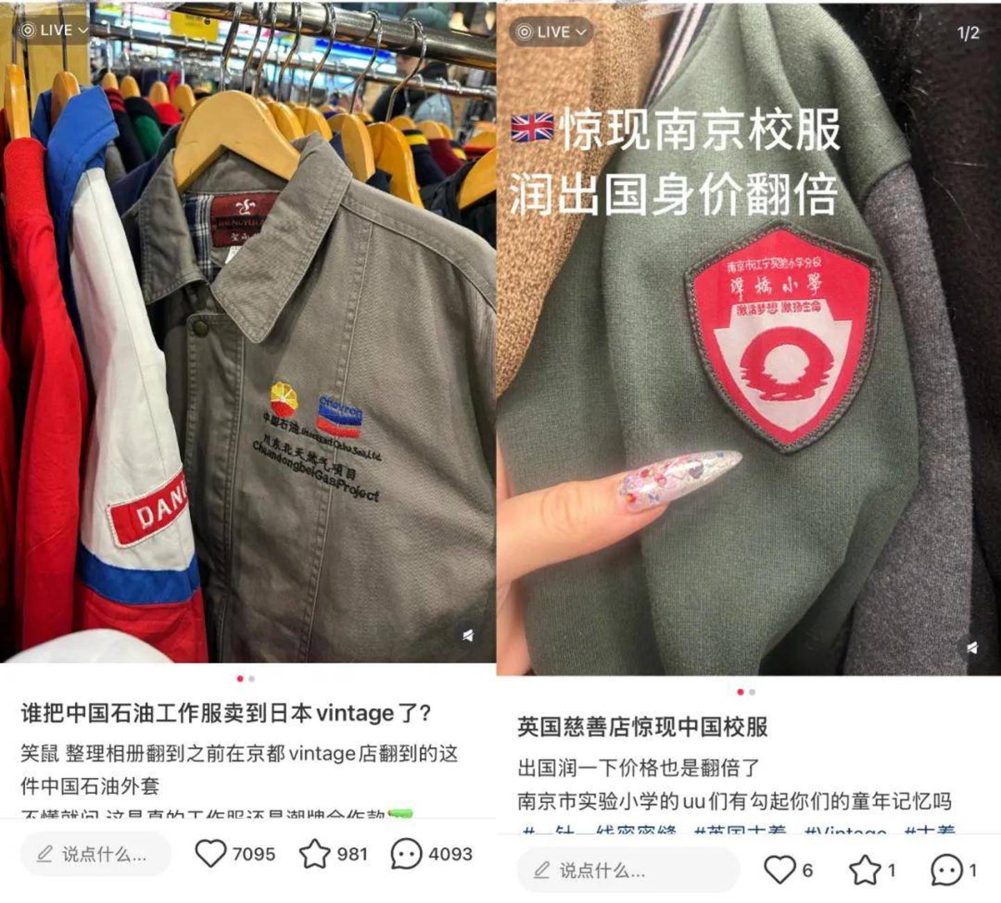 在英国一家慈善店的二手衣陈列柜里,一件印着“南京市实验小学”的绿色校服外套,标价20英镑;在日本京都祇园的古着店橱窗里,印有“中国石油”的工作服成了店里的“潮物”。