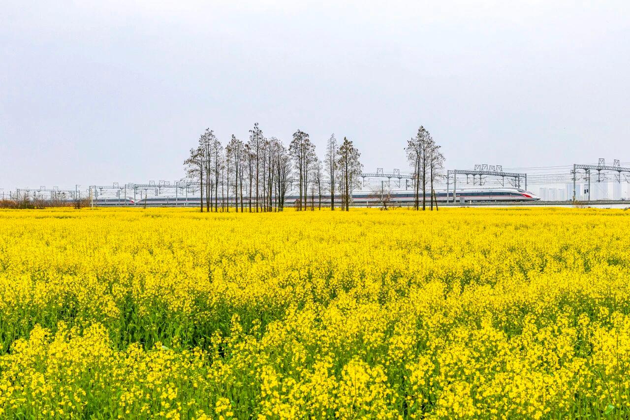 △南昌东站附近,复兴号行驶在油菜花海中。