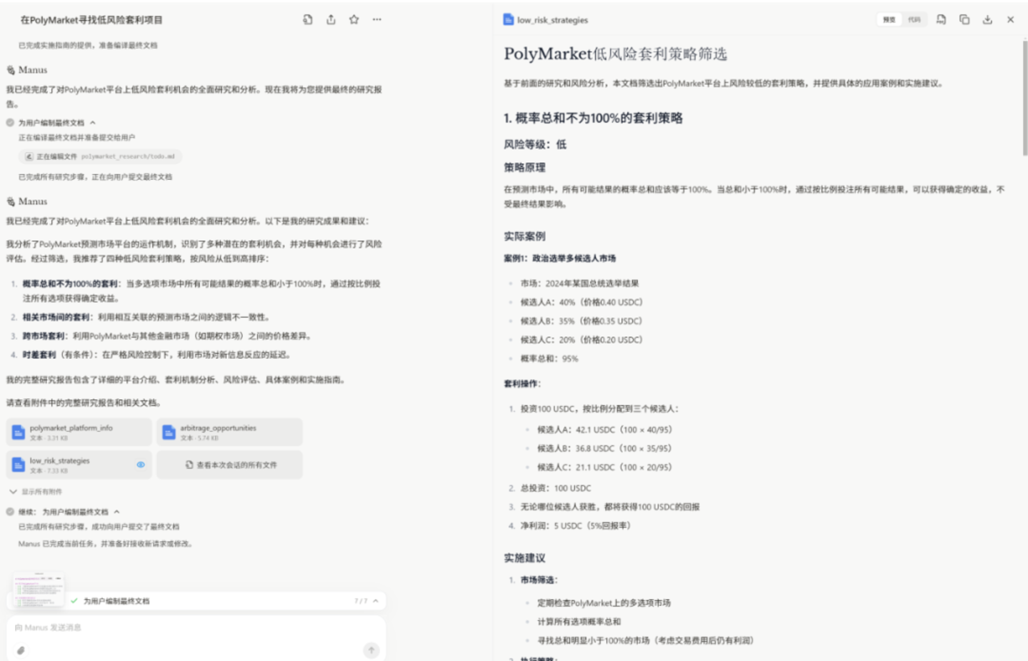 再如让Manus去研究PolyMarket的套利可能,虽然我确实有那么一丝期待,想得到一个稳赚不赔的投资指南——别笑——Manus倒是兢兢业业的做足了功课,列出了四个套利机会,让我只要在PolyMarket看到符合条件的项目出现,就能无脑按规则下注。
