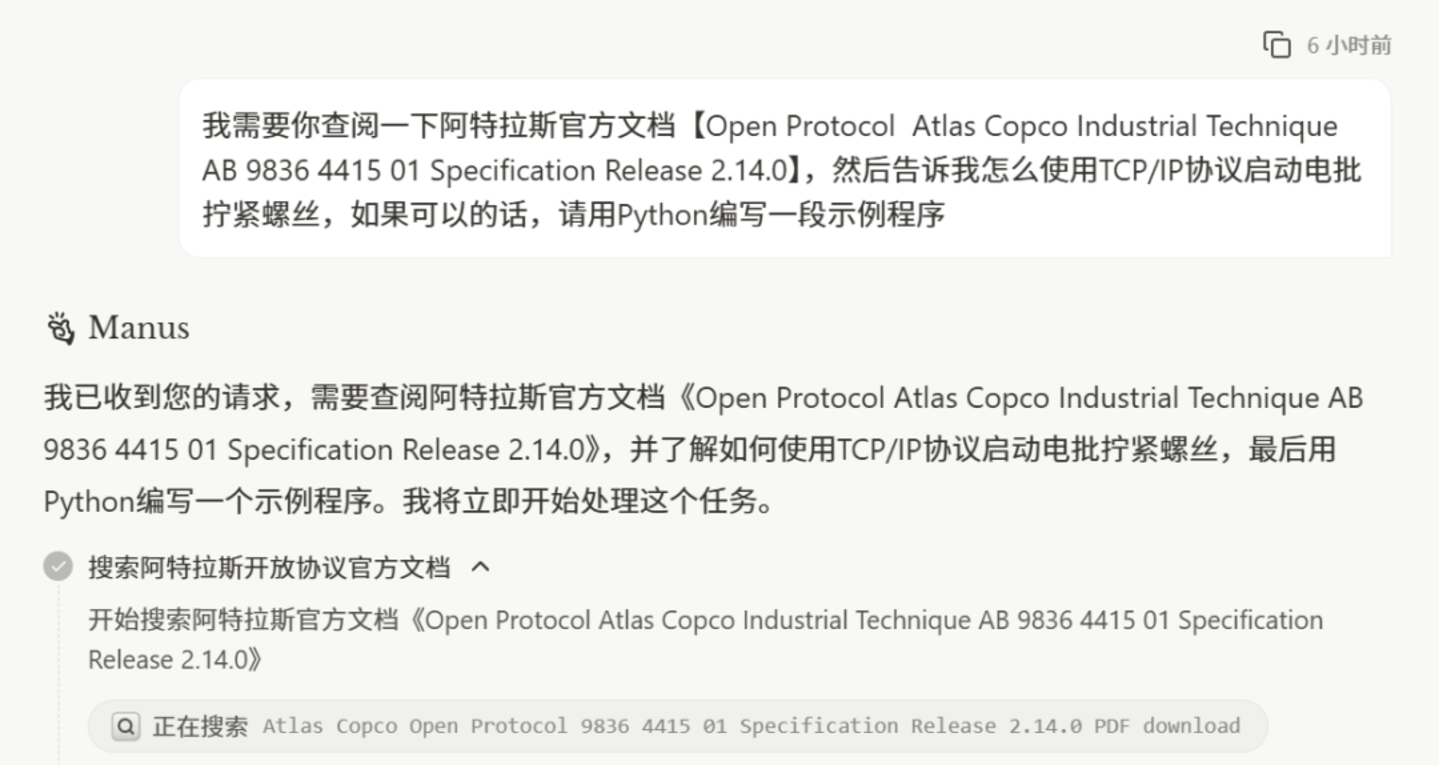 注意啊,这个需求理论上普通的对话式AI也能接住,但会需要更多的交互流程,比如你得把文档喂给它,一步一步的得到答案,但是Manus不需要这些,它会自己去阿特拉斯官网下载文档,读完之后找到解决问题所需的关键内容,仔细分析,创建程序,最后的代码我发给了朋友,有点小瑕疵但手工修改之后完全可用,直接省掉了一次售后呼叫的次数。