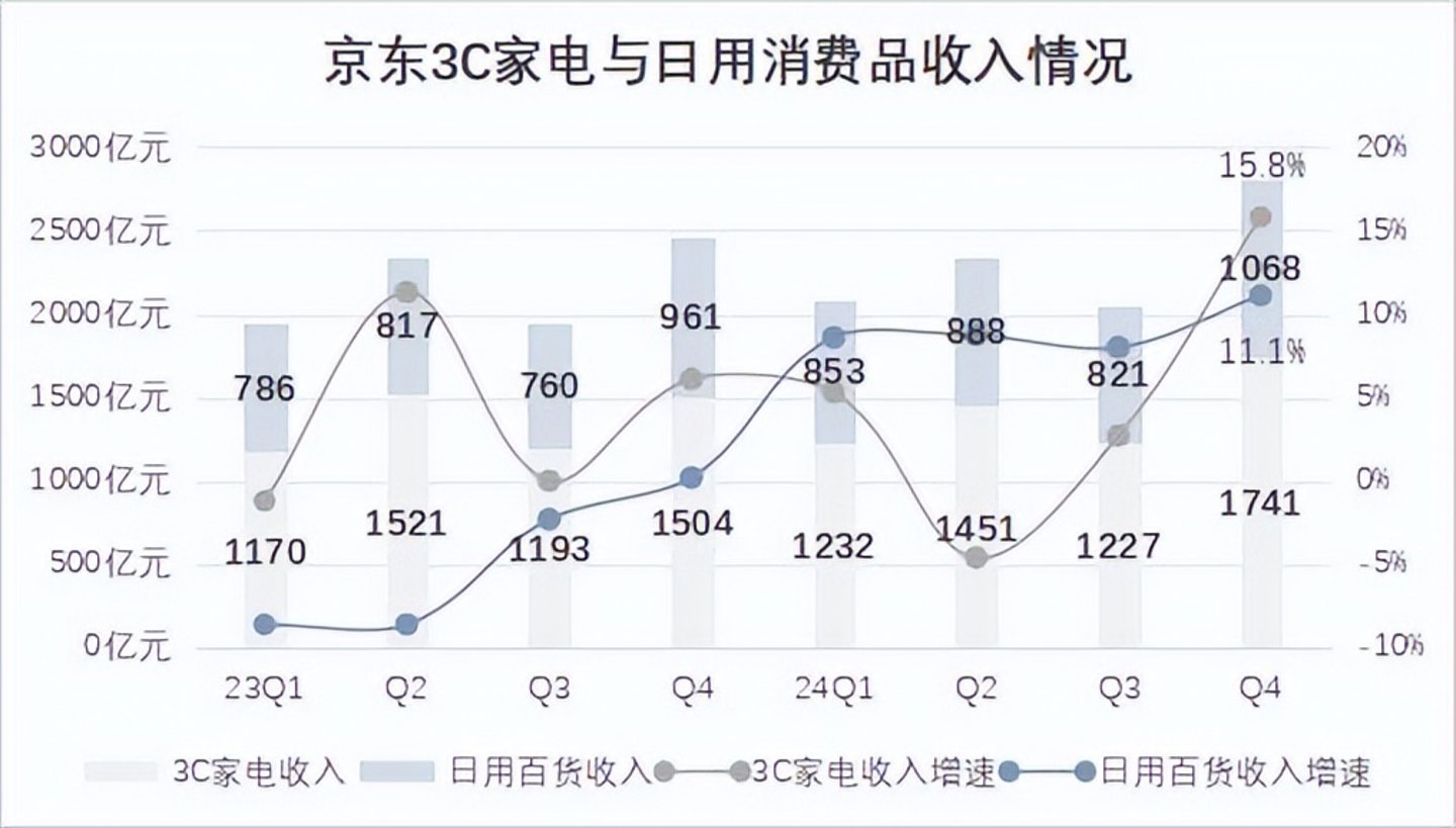 截至第四季度,京东零售日用消费收入1068.3亿元,同比增长11.1%,在基数更低的情况下,增速被3C家电甩开了差距。