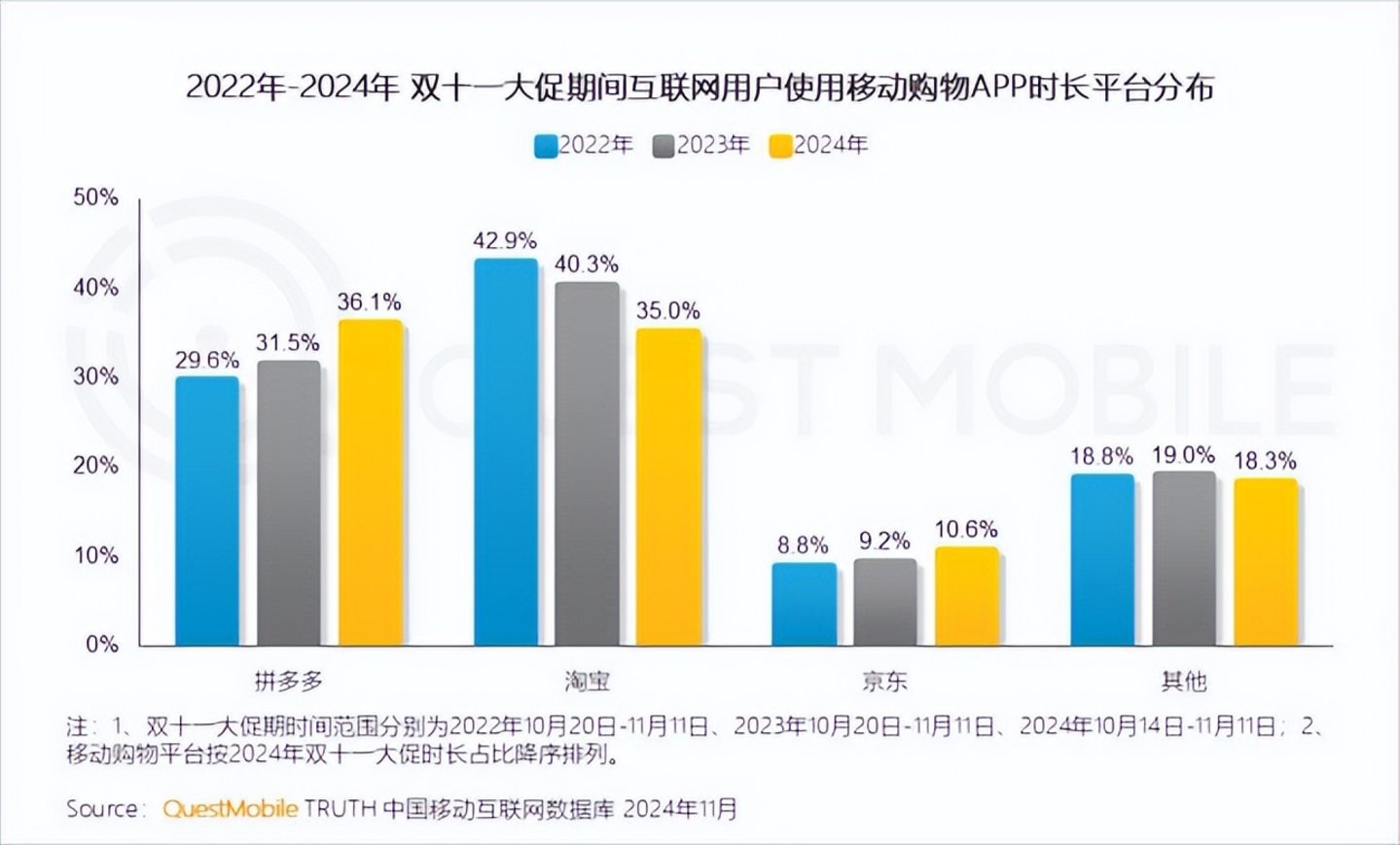 和淘宝、拼多多相比,京东的用户使用时长一直是硬伤。Questmobile数据显示,2022-2024年“双11”期间,用户使用京东App的时长占比远低于淘宝和拼多多,但在拼多多的挤压下仍维持了小幅度的增长,从8.8%涨到了10.6%。