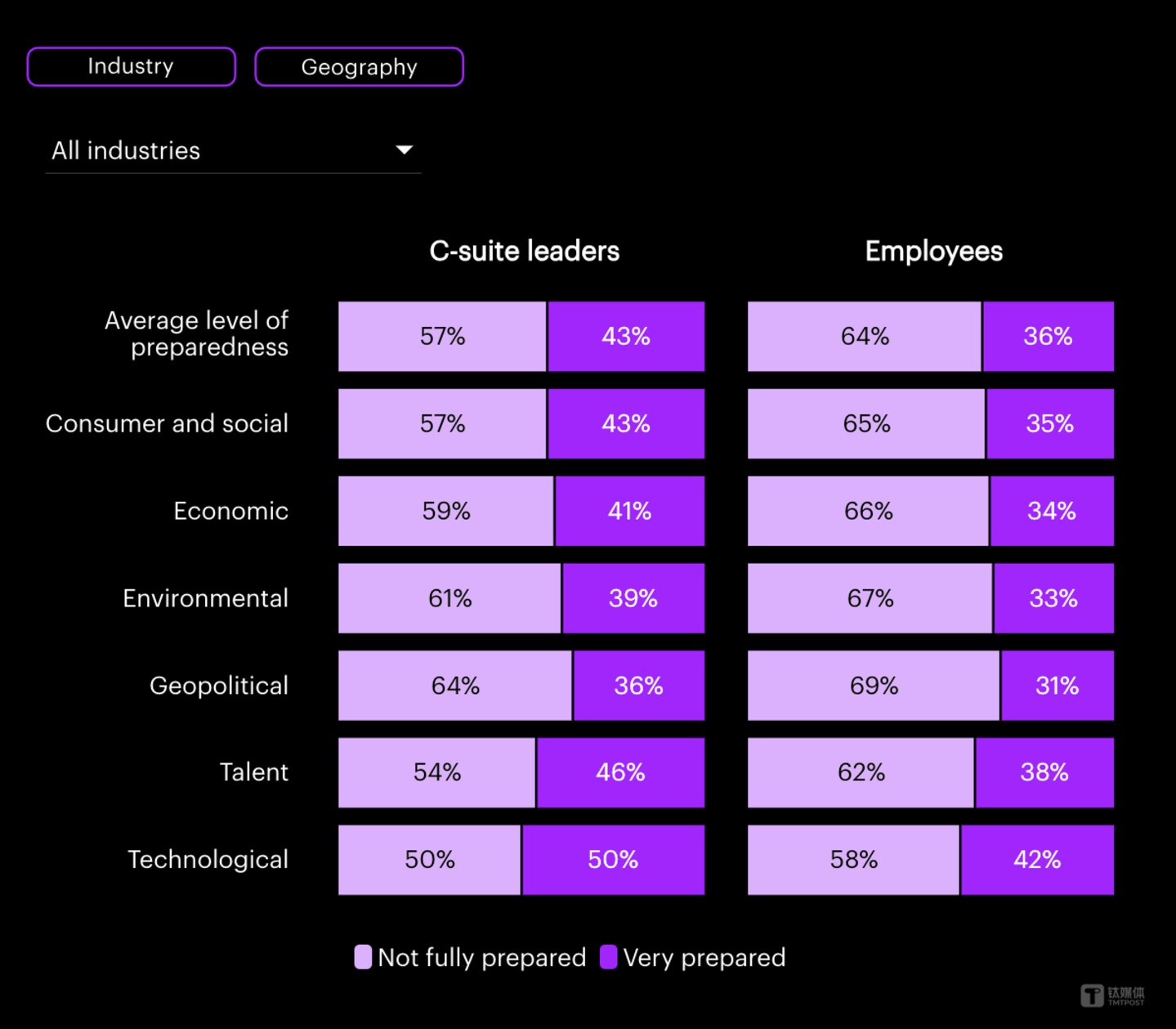 钛媒体观察:相较于人才和技术准备,组织对环境和地缘政治的信心准备更加不足。