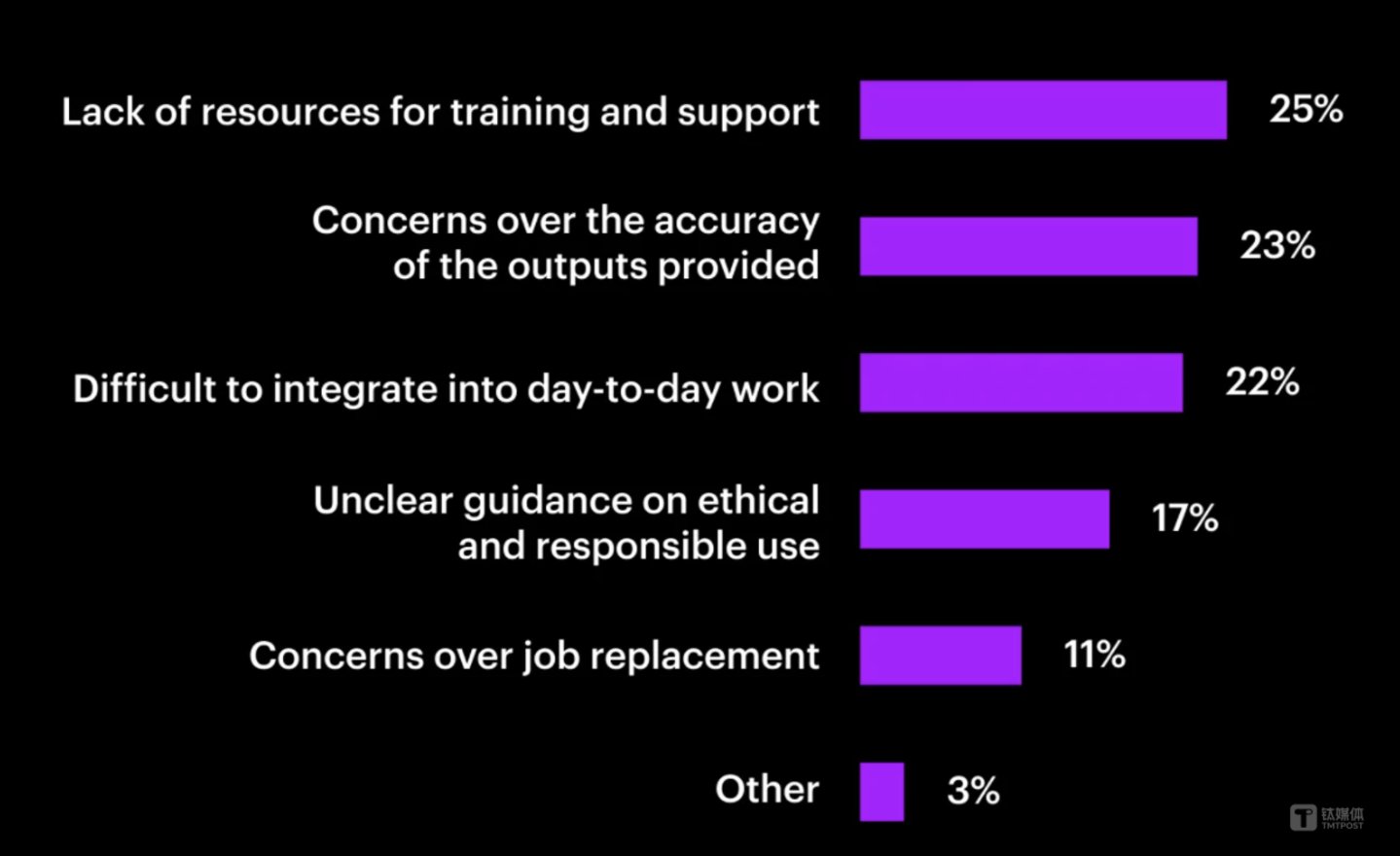 全球范围的调研数据显示,员工在工作中未使用生成式AI的几大原因中,25%在于缺乏培训和支持资源;23%则对工具的准确性表示担忧;22%认为难以融入日常工作;17%出于道德和负责任使用上缺乏明确指导;11%则是对工作替代的担忧。