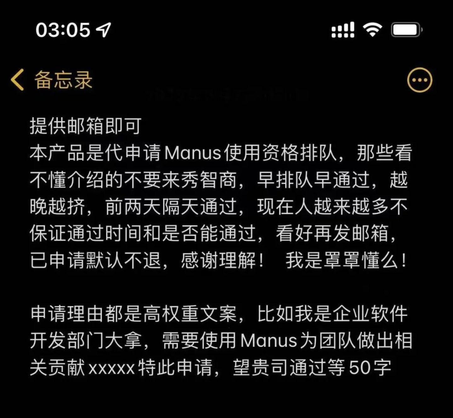 但随着闲鱼平台对这种行为的限制,很多人开始转而卖几块钱的Manus教程,甚至还有帮你代申请邀请码,当我们问对方和自己去官网申请有何区别时,对方沉默不语,只是丢过来一张截图: