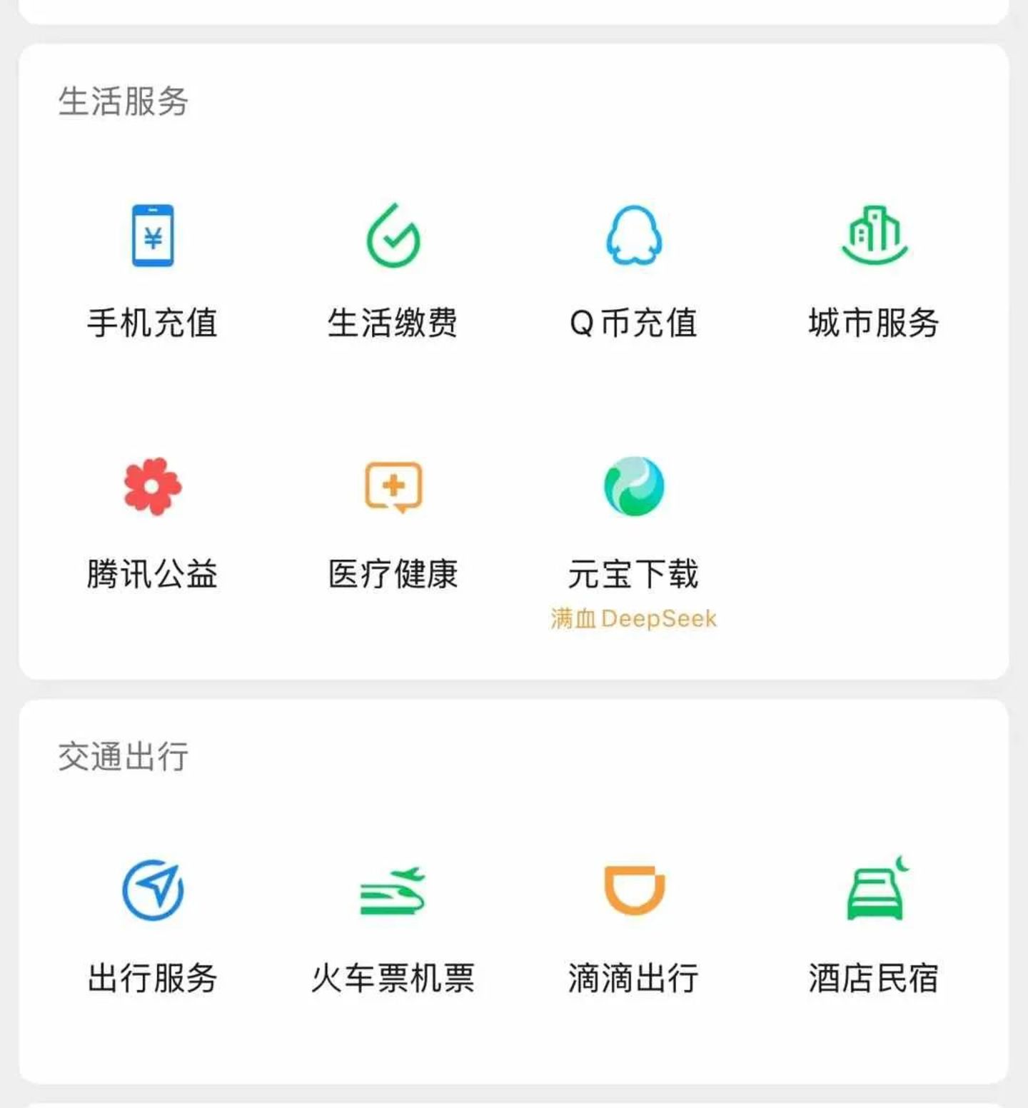 更值得关注的是,腾讯最大的流量入口,微信除了搜索接入DeepSeek,实际由元宝提供服务,还在生活服务九宫格内给元宝提供下载推广,又是红点、“new”提醒,还带着“满血DeepSeek”的标注。不禁让人惊呼,腾讯豁出去了,张小龙也不“克制”了。