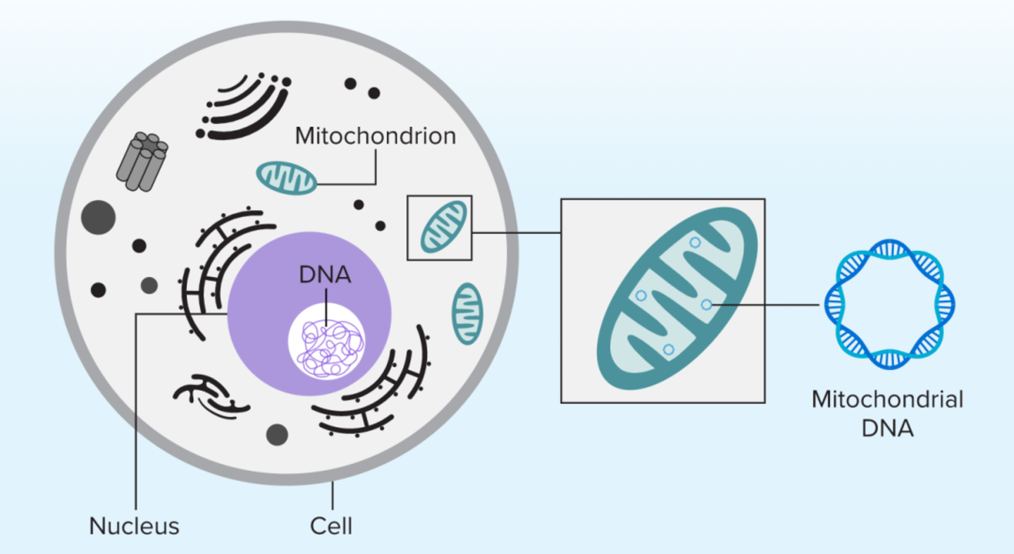 ▷构成人类基因组的DNA存在于人体的细胞核中。然而,线粒体拥有独立的环状DNA,这有可能是从远古细菌时期流传下来的。图源:Knowable Magazine