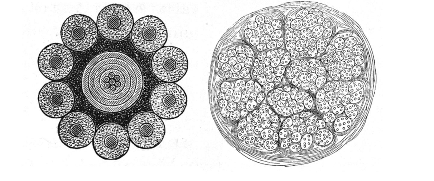 ▷Kapp 对电信电缆横截面(左)与神经纤维横截面(右)的比较。图源:Grundlinien einer Philosophie der Technik