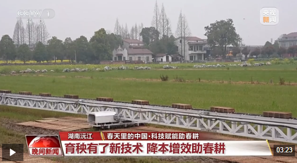 湖南益阳沅江市正在开展水稻育秧工作,秧苗田里的履带式桁车平稳行进。过去的桁车需要专门在田间架设多条轨道才能行进,而今年新引进的这款履带式桁车搭载了行走系统,特别适用于复杂、松软或不平整的作业环境。此外,桁车还打造了自动喷淋装置,可大幅提升作业效率和育秧效果。