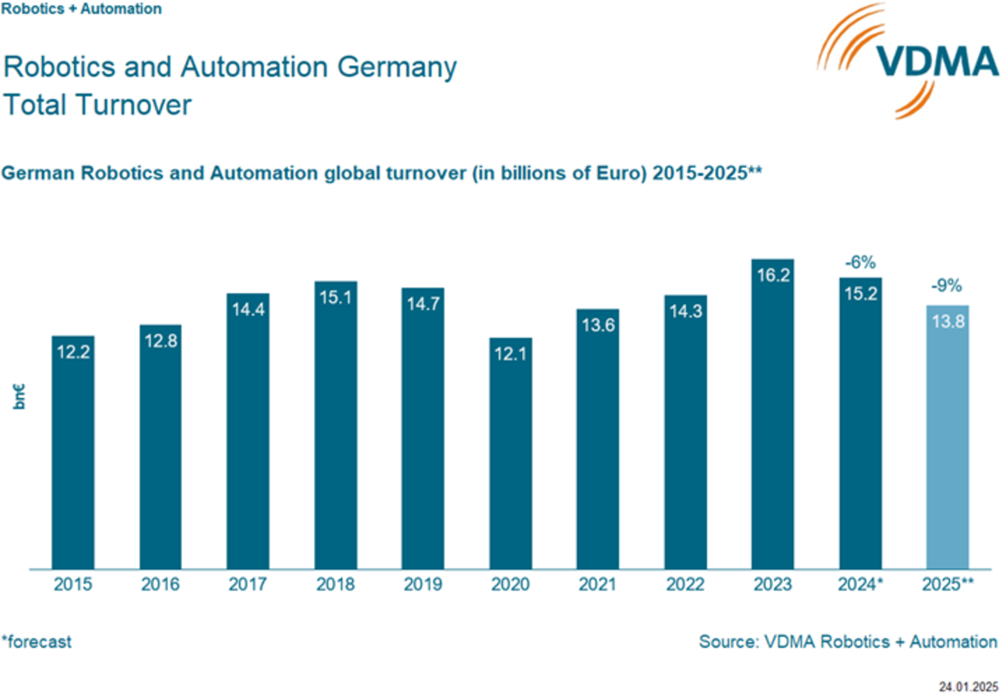 德国机械设备制造业联合会 (VDMA)近期的一项预测显示,2025年,德国机器人和自动化设备销售额预计将下降9%至138亿欧元,而去年的销售额为152亿欧元,下降了6%。