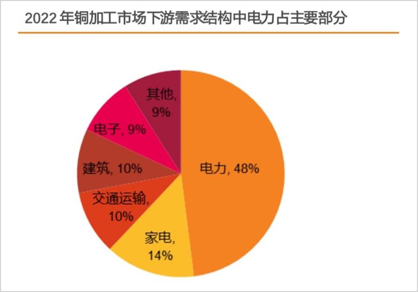 从应用场景来看,电力是铜最主要的下游客户,以国内为例,2022年电力耗铜占铜总消耗量的比重达到48%,家电次之,占比14%,其余依次是交通运输、建筑、电子,占比大约为9%-10%。