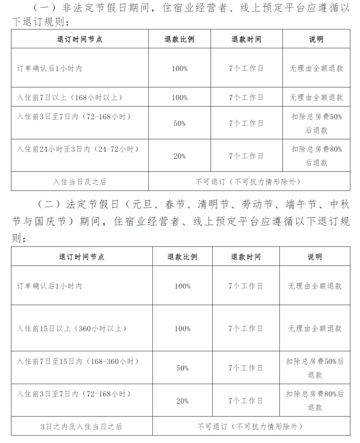 上述意见提到,法定节假日(元旦、春节、清明节、劳动节、端午节、中秋节与国庆节)期间,住宿业经营者、线上预定平台应遵循客房入住前15日以上可无理由全额退款规则。非法定节假日期间,是7天以上无理由全额退款。