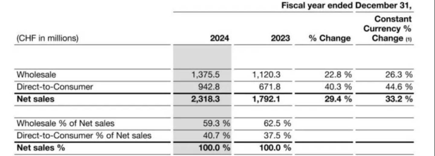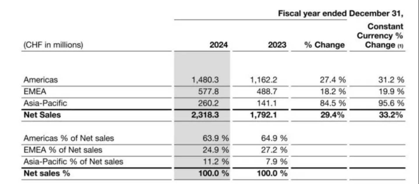 美洲市场增长27.4%至14.8亿瑞士法郎,保持盈利方面的核心地位,但《天下网商》对比2023年财报发现,其增速已略低于2023年的34.5%,步子开始放缓。欧洲、中东及非洲(即财报提到的EMEA)市场增速为18.2%,销售额为5.78亿瑞士法郎(约合人民币47.14亿元),增速较2023年的15.2%有所提升。