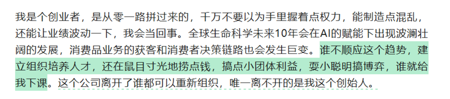 而产品复购率还没来得及在财报中展示,华熙生物的后院就先起了火,短期内的发展方向调整,造成了资源分配的迅速变化,引致一系列的内部问题。从之前枝繁繁事件中提及的职场霸凌、到我们看到内部信对腐败问题的言辞激扬,内斗不断加剧。