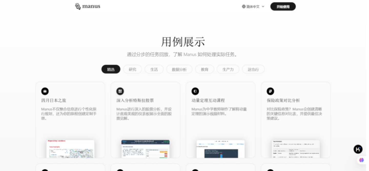 Manus的官网(https://Manus.im/usecases)给出了一些例子可以供我们更加直观的了解Manus的能力,可以看到它的功能在官方演示中确实特别强大,目前Manus的使用需要提前获取邀请码。