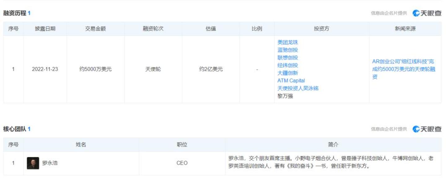 在此之后,罗永浩便开始四处融资扩张规模。“天眼查”显示,2022年11月,细红线科技宣布完成了约5000万美元的天使轮融资,投后估值达到2亿美元。此轮融资由美团龙珠领投,蓝驰创投、联想创投、经纬创投、大疆创新等知名投资机构以及黎万强、吴泳铭等科技界人士纷纷跟投。
