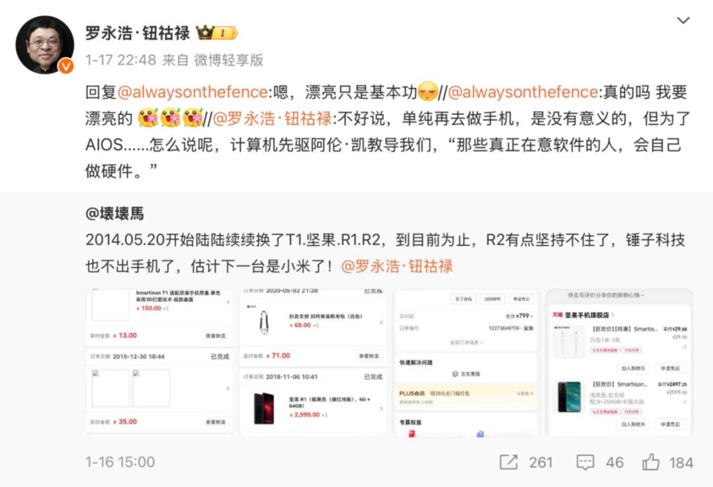 此前,有锤子手机粉丝表示自己已经陆续使用过锤子T1、坚果R1、坚果R2等多款手机,但目前面临选择新机的困境,因为锤子科技已经很久没有推出新手机了,并考虑转向小米品牌。令人意外的是,这条消息竟然得到了罗永浩本人的亲自回应。